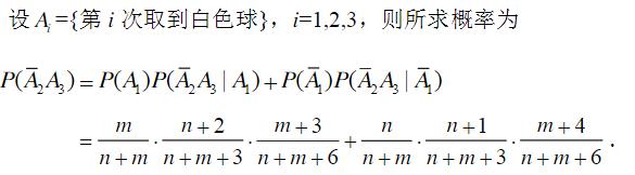 设袋中有n个黑球,m个白球,现从袋中依次随机取球,每次取一个球,观察颜色后放回,并加入1个同色球和2个异色球. 求第二次取到黑色球且第三次取到白色球的概率.
