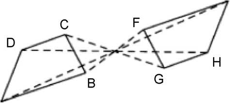 ⏺⏺解析]根据中心对称的性质,分别连结 CG、 BF,则它们的交点 O 为两四边形的对称中心.其理由是关于中心对称的两个图形,对称点所连线段都经过对称中心,而 CG、BF 两线段不共线,所以它们的交点即为对称中心.